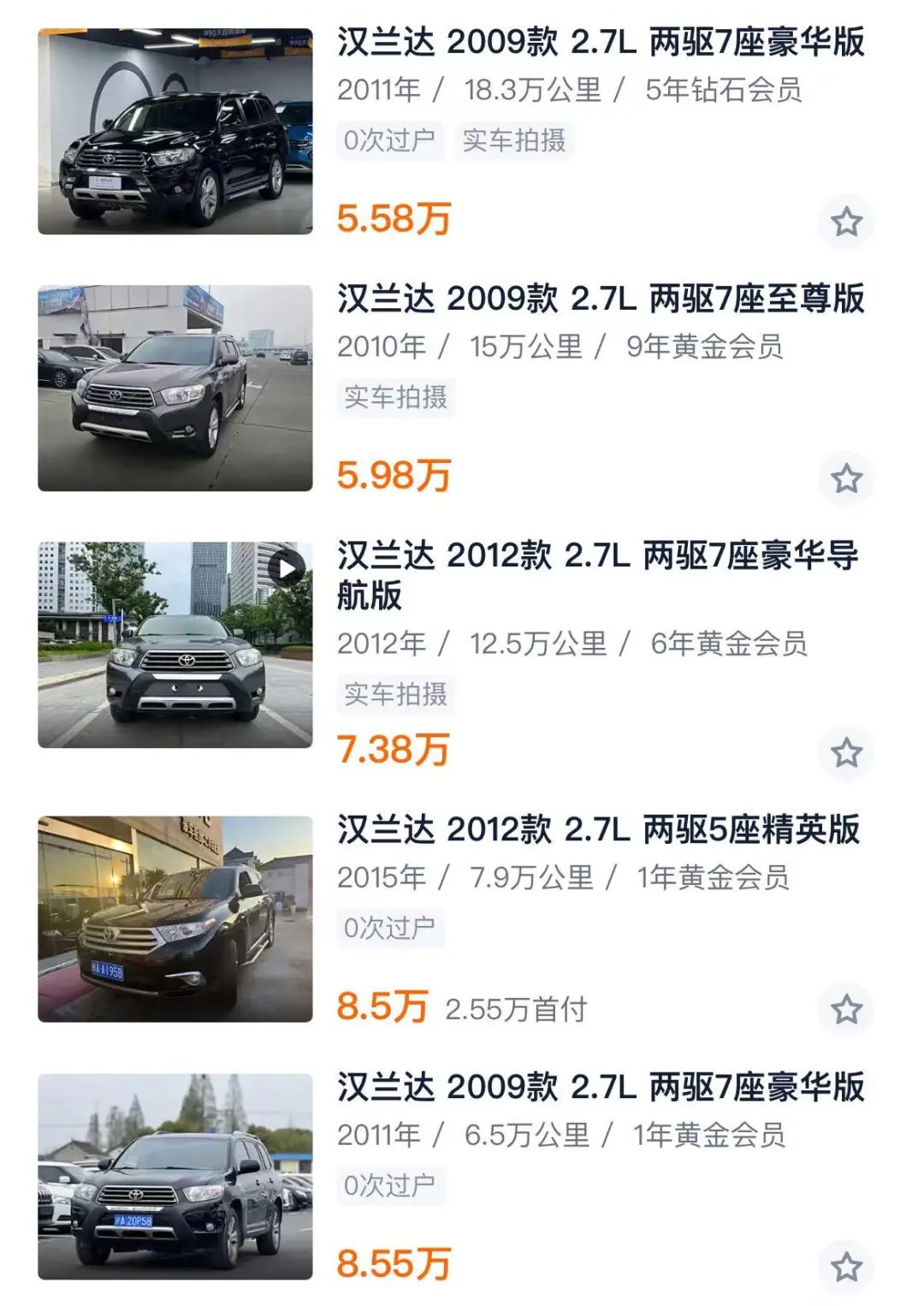 国内自然找不到06款那么老的汉兰达,不过笔者随手搜了搜二手车平台,里程数略少、车龄略短的汉兰达两驱高配,这价格比之美国的二手车行情,只是略便宜一些(6万人民币对比8500~9000美元)的程度。真正价格被拉开的,是新车。