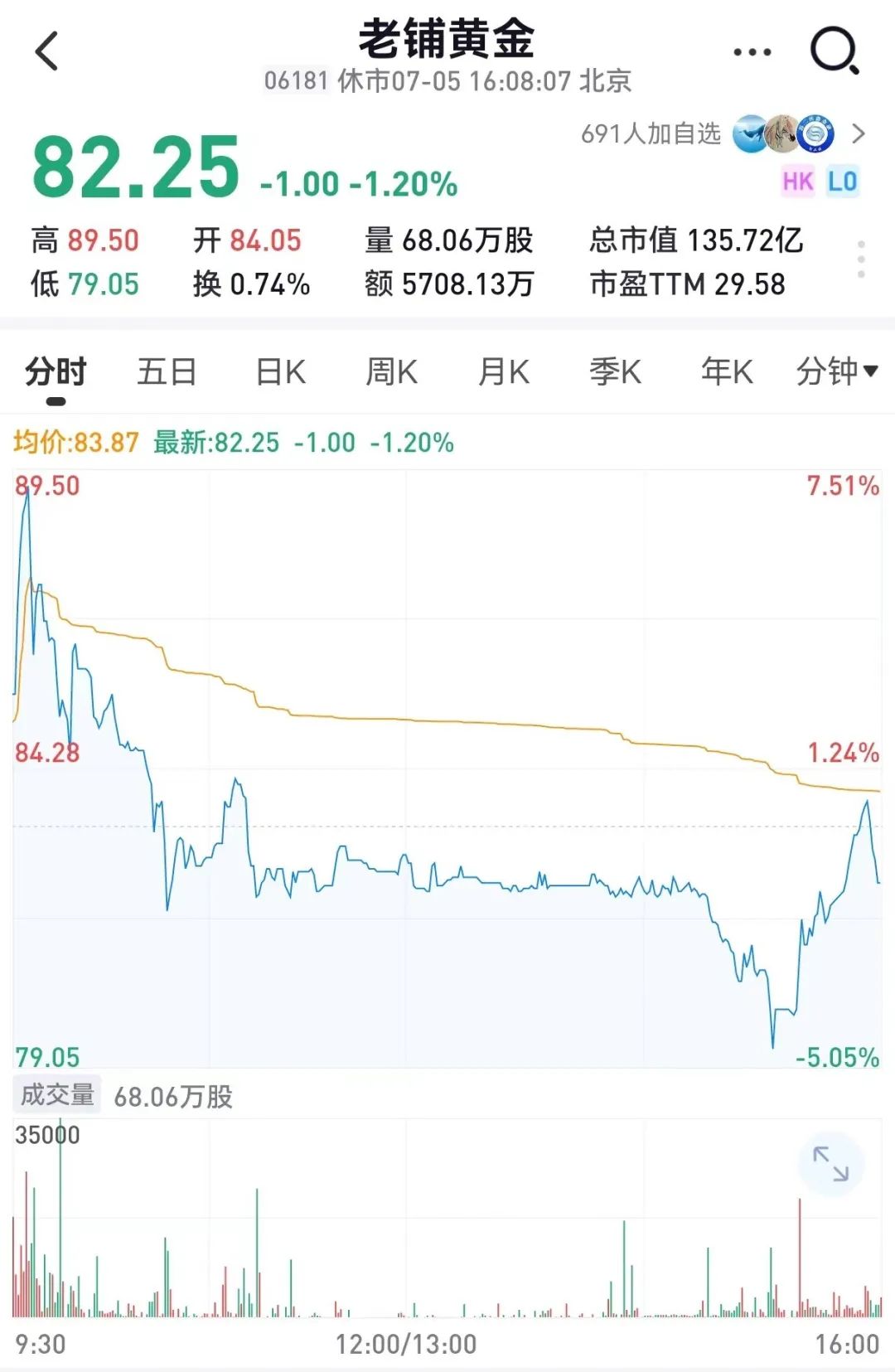 截至7月5日收盘,老铺黄金报收82.25港元/股