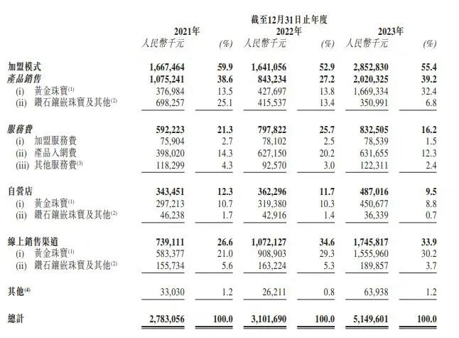 2021年-2023年,周六福靠加盟模式获得的收入分别为16.67亿元、16.41亿元及28.53亿元,占总收入的比重分别为59.9%、52.9%和55.4%,连年超过五成。