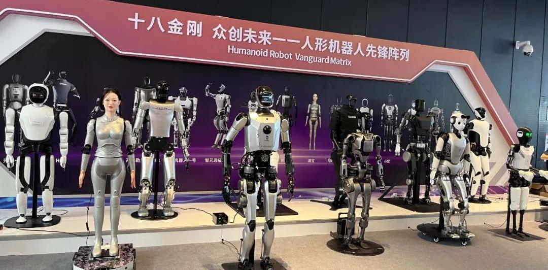 来自国家地方共建人形机器人创新中心、达闼、复旦大学、傅利叶、宇树科技、开普勒、清宝机器人、乐聚等企业和单位的人形机器人,组成了“十八金刚”阵列,展示了如何通过控制实现动态协同并完成统一动作,大量观众驻足观看。