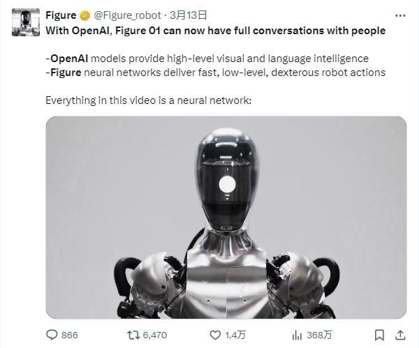 Figure 01就是一个很好的体现了AI赋能人形机器人的例子。今年3月,在与OpenAI宣布合作13天后,该公司就展示了装有OpenAI提供的视觉语言模型(VLM)的人形机器人Figure 01的演示视频。