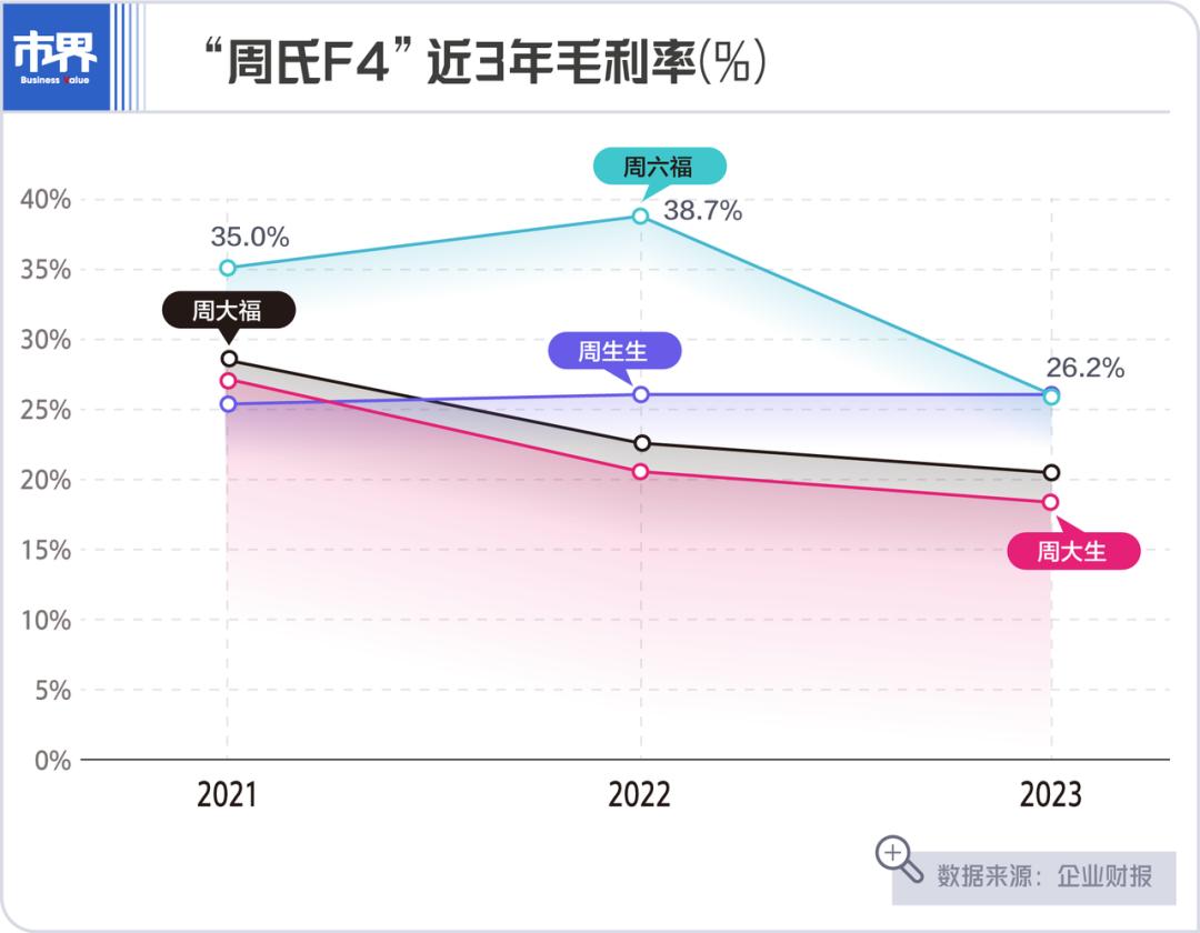 周六福的毛利表现,虽然不及瞄准高端市场的老铺黄金的41%,但比起“周氏F4”中的其他三位,他的毛利率前值稍高一些,底气也要更足一些。