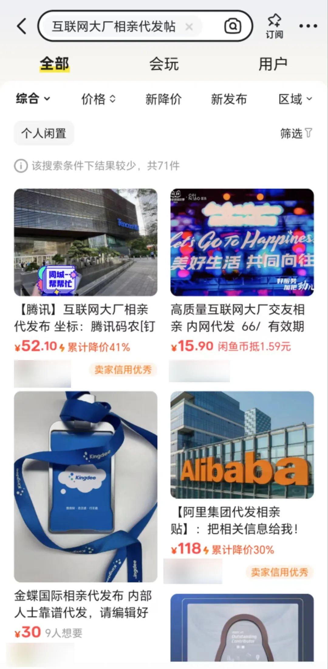 在闲鱼代发帖的介绍页中,记者常见“高质量互联网大厂内网交友相亲”“多金有趣的程序员小哥哥或是麻利多才的运营小姐姐”等广告语。不过,可以清晰地看到,无论是买家、卖家、大厂员工,皆在强调“警惕之心”的重要性。
