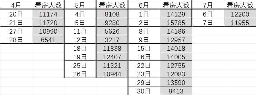 我把四月以来每周末的看房人数放在一起各位可以感受下 。