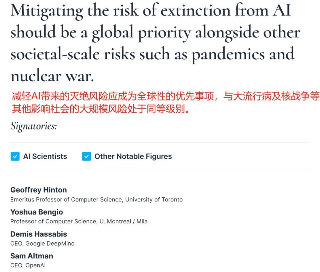 2023年5月30日,包含OpenAI CEO Sam Altman,谷歌DeepMind CEO Demis Hassabis和Anthropic CEO Dario Amode在内的,数百位AI行业领军人物联合签署了一份声明。