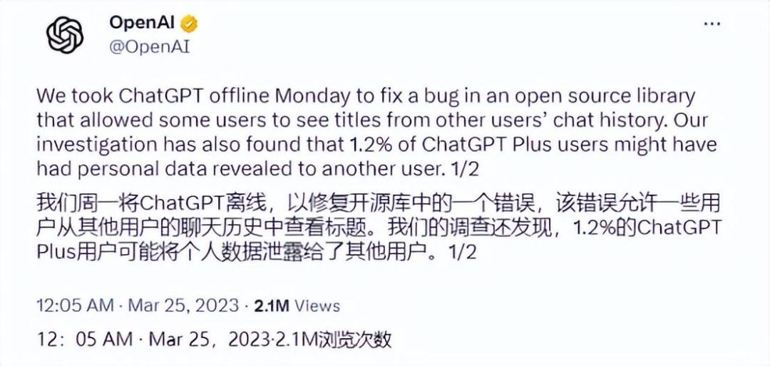 3月25日,OpenAI 发文证实,部分 ChatGPT Plus 服务订阅用户可能泄露了部分个人隐私和支付信息,称在本次关闭 ChatGPT 几个小时前,部分用户可能会看到另一位用户的姓名、电子邮件地址、支付地址、信用卡信息。
