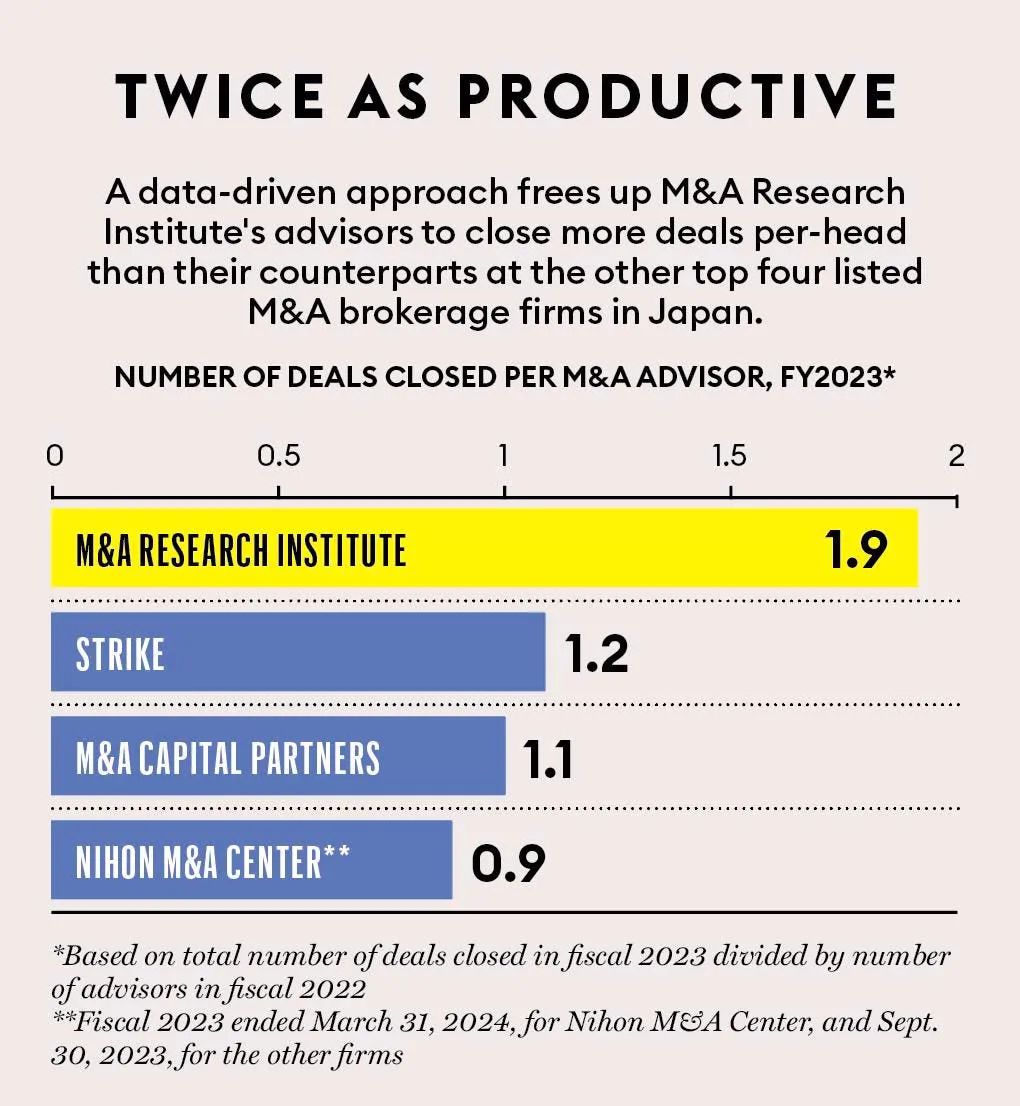 *数据驱动的方法使「并购研究所」的顾问们能够比日本其他四家上市并购经纪公司的同行们,以人均水平完成更多的交易。