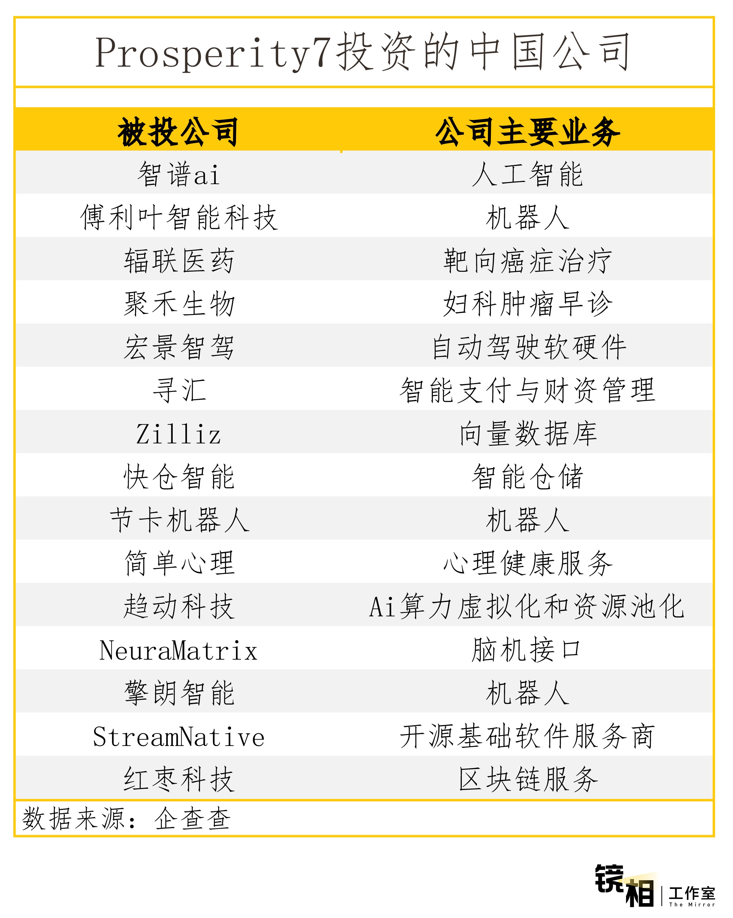 据企查查数据,从2020年至今,Prosperity7已投资了包括聚禾生物、宏景智驾、傅利叶智能科技在内的15家中国公司,涉及领域包括医疗健康、人工智能、新能源汽车、金融支付等。