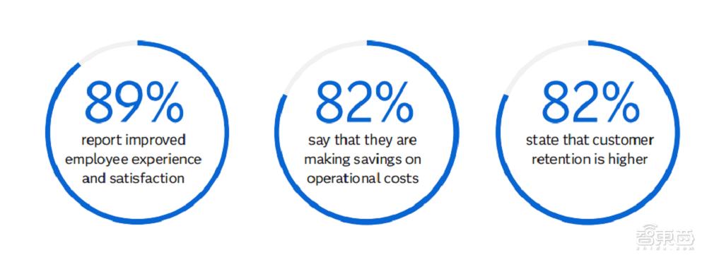 89%的受访组织表示,生成式AI在组织中的使用改善了员工的办公体验和满意度,82%的受访组织表示使用生成式AI可以节省办公和运营的成本,另外,他们还认为利用此种工具可以提高客户的留存率。