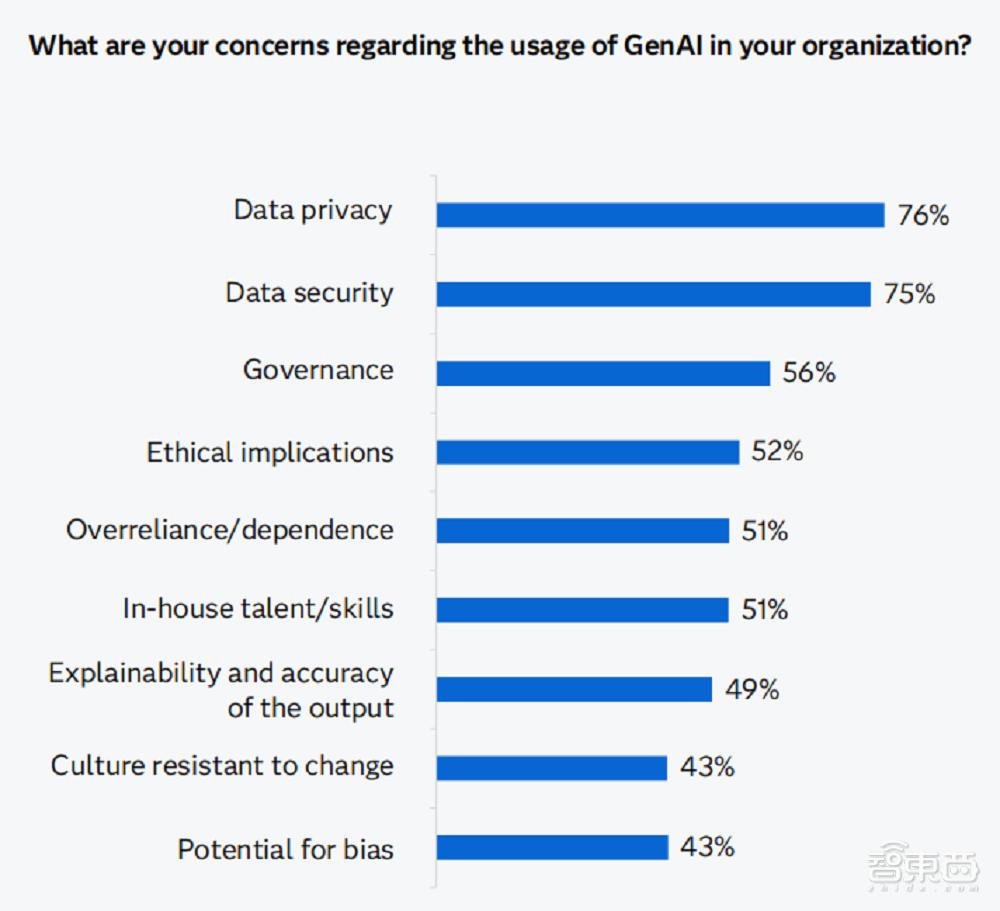 报告显示,四分之三的受访组织担心在使用生成式AI时的数据隐私和安全性,受访组织的其他担忧还包括管理难度、伦理风险、过度依赖以及生成式AI的准确性等。
