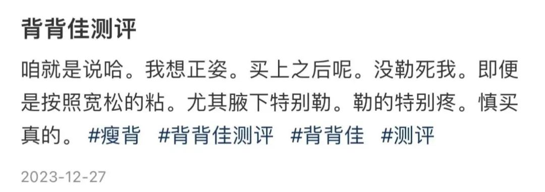 在社交平台上,有关背背佳穿戴存在不适感的分享帖常有讨论,有网友表示只要身体稍微放松,不再挺直,立马能感受到“胳肢窝生疼”。这一点也被网友称之为是“美丽刑具”,意指获得美丽必经的的痛苦。