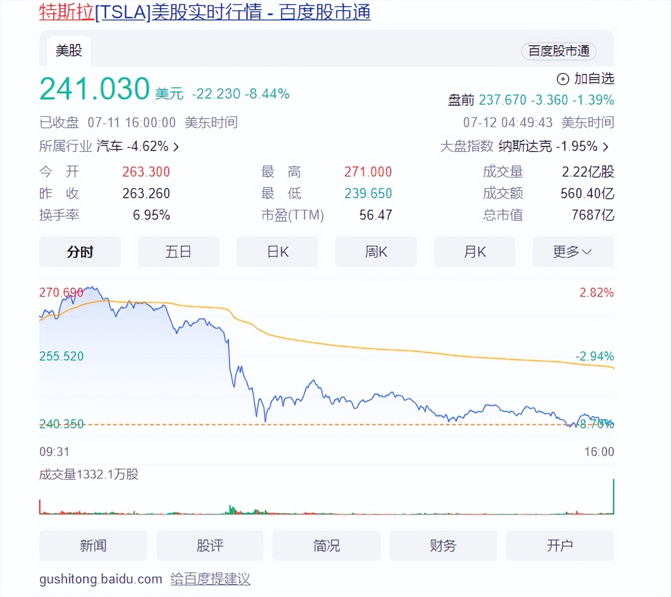 这一消息传出,惊起股市千层浪。截至美东时间7月11日收盘,特斯拉的股价下跌8.44%,报241.03美元/股,总市值缩水709亿美元至7687亿美元。