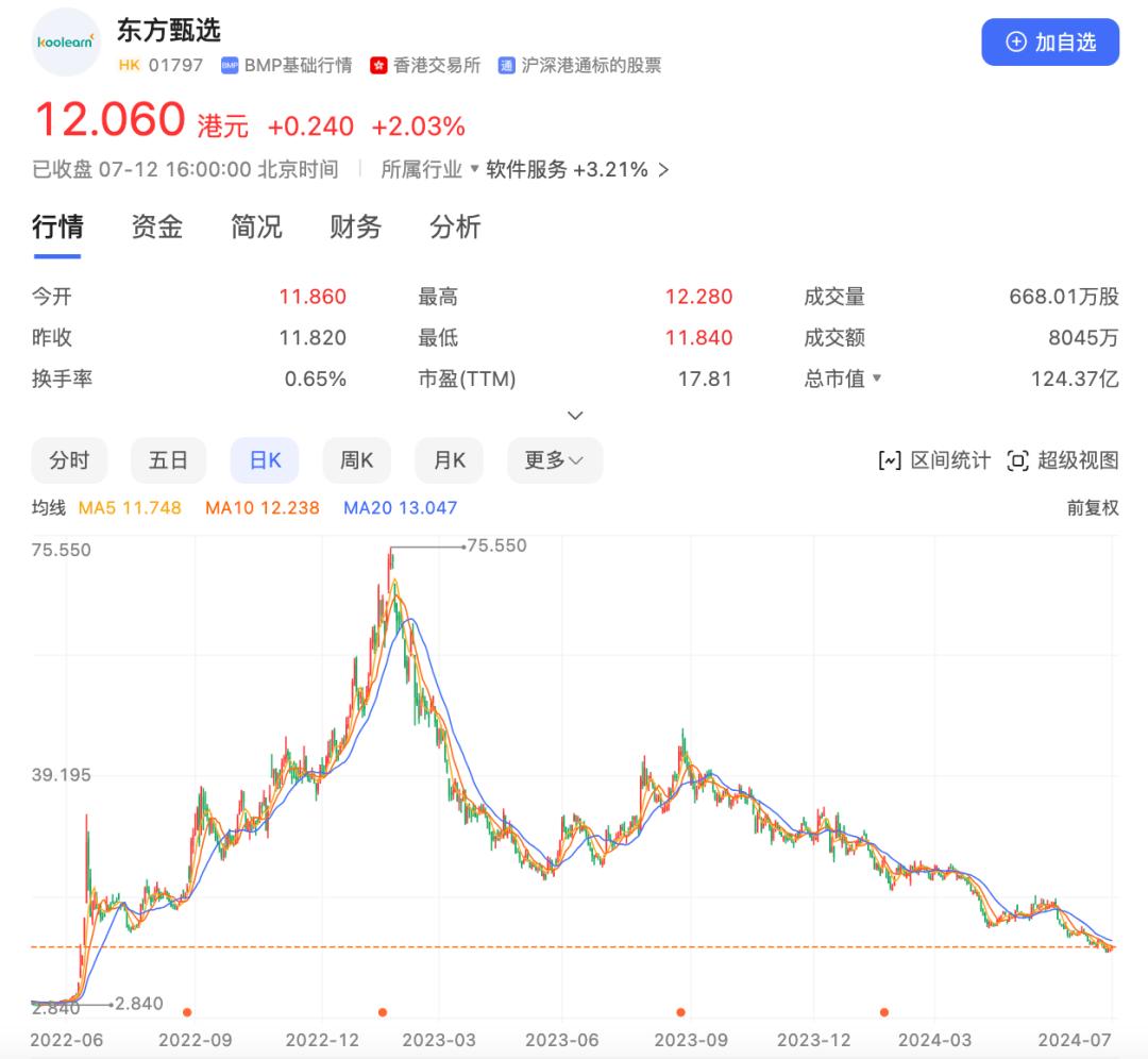 自2021年末转型直播带货至今,东方甄选股价涨幅曾超过26倍,但这家重新回到闪光灯下的公司风波不断,管理混乱的标签,在东方甄选身上贴得愈发牢固,这显然会引发外界的质疑和担忧,引发一次次的股价震荡。股价也从75.5港元/股的高点下跌至当前的12.1港元/股,小作文风波以来的半年,股价从31港元/股缩水至12.1港元/股。