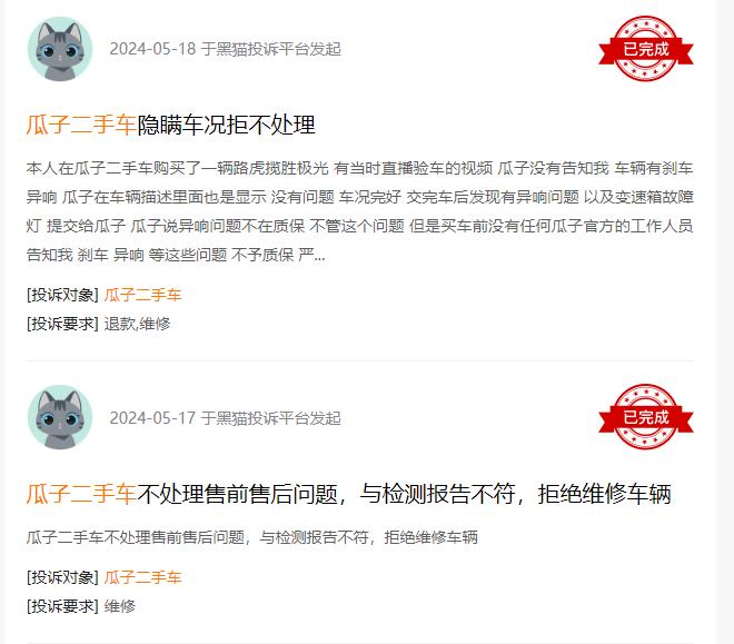 面对这些问题,瓜子二手车通过瓜子官方检、直播看车等方式想要打破这种信息差。但从黑猫投诉平台上大量消费者的投诉来看,瓜子二手车想要彻底打破这种信息差并非易事。