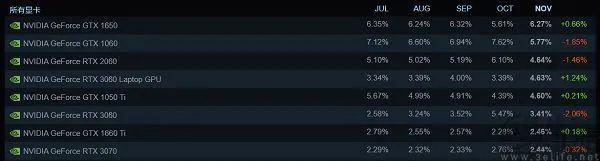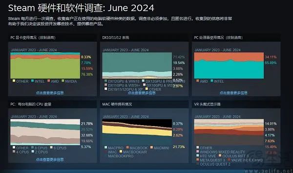众所周知,作为全球最大的数字游戏分发平台,valve旗下的Steam一直在统计玩家所使用的CPU、显卡,以及Direct图形加速接口版本。为什么在2023年之前的很长一段时间里,面向PC端推出的游戏推荐配置/最低配置总是GTX 1060?要知道,基于Pascal架构的GTX 10系列是2016年上市,后续英伟达更是陆续推出了RTX 2060、GTX 1660、RTX 3060等同档产品。