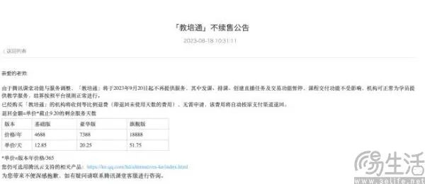 其实腾讯课堂被放弃早有征兆,其官方公众号最近的一次更新还是在2023年2月28日,并且整个2023年也只有这一条推送。此外在去年的8月18日,腾讯课堂方面还发布了教培通不续售公告称,由于功能与服务调整,教培通将于2023年9月20日起不再提供服务,发课、排课、创建直播任务及交易功能暂停。