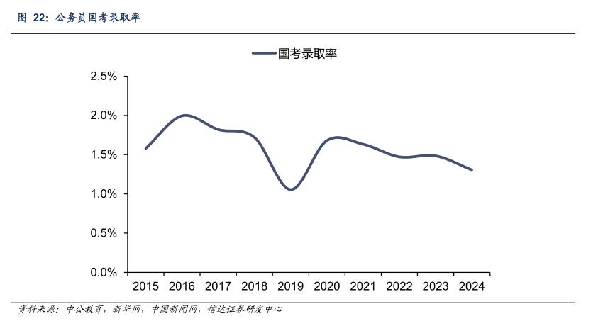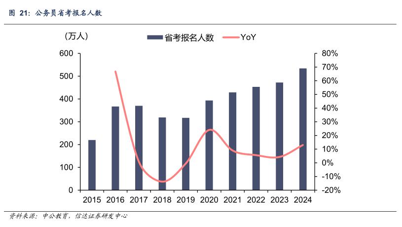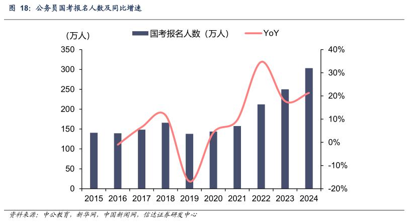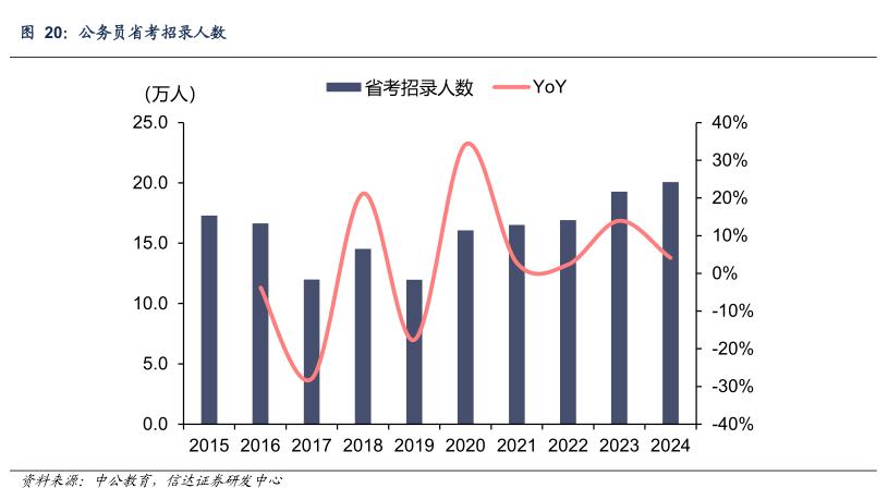 我国公务员考试报名人数有望持续快速增长。近 3 年以来,我国国家公务员考试报名人数增长提速,CAGR 达到 24%,虽然录取率持续降低,竞争愈发激烈,可以参考 19 年机构改革时,招录人数减少 49%,而报名人数仅下滑 17%,当年录取率仅为 1.1%,可见录取率低并不会显著妨碍参加考试的意愿。另外,省级公务员考试报名人数在 24 年也有提速的趋势,而录取率高于国考,未来有望复制国考的趋势和走向。综合考虑我国的人口背景、就业情况以及求稳的求职心态,我们认为,我国公务员国考报名人数有望持续快速增长,省考报名人数有望提速。