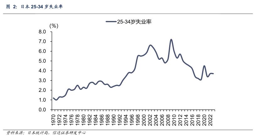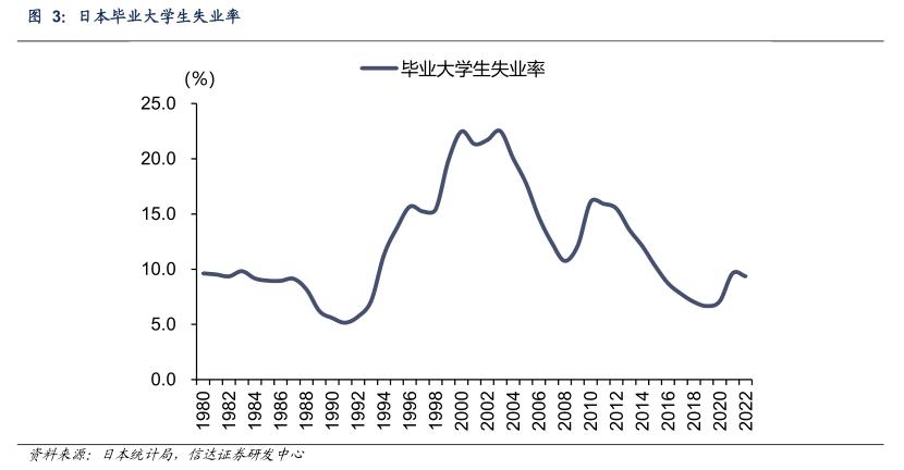 日本泡沫经济破灭后,年轻人面临着严峻的就业挑战,进入「就业冰河期」,1968~1977年出生的一代人也被称为「就业冰河期一代」。从 93 年开始,日本失业率不断攀升,25~34 岁失业率在高峰时达到 7.2%,毕业大学生失业率在高峰时达到 22.5%。