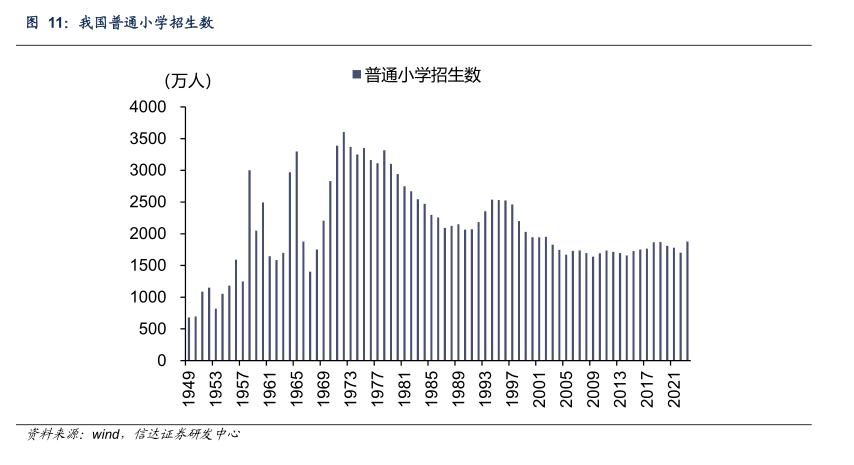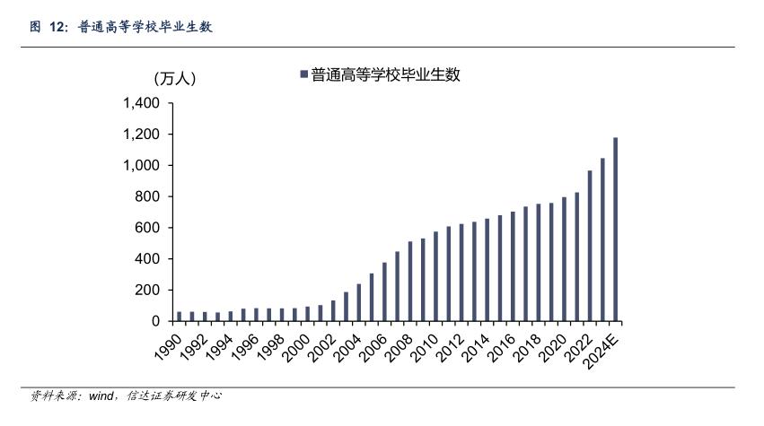 我国出生人口在 03~17 年稳中有增。我国出生人数虽然在第三次婴儿潮(86~90 年)后开始下滑,但 03~17 年企稳并略有增长,每年超过 1500 万人,从 18 年开始出生人数再次下滑。23 年我国普通小学入学人数还未出现下滑的趋势,24 年高校毕业生数有望再创新高,因此,我们估计在中长期(至 2039 年左右)我国考公群体基数依然在不断扩大,与日本「失去的二十年」的人口结构有根本的差异。