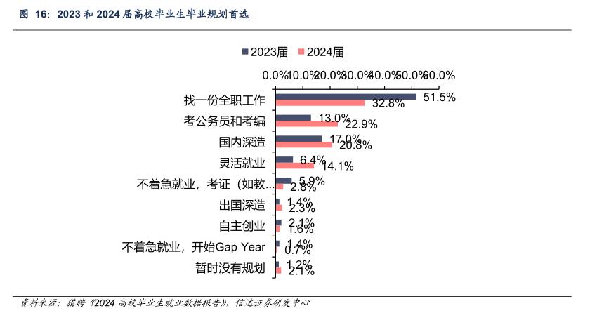 年轻人就业压力大,「求稳」意愿驱动考公考编热情。我国就业人员调查失业率在 23 年 6 月之后停止更新,在停更前,16~24 岁人口失业率不断提升,23 年 6 月达到 21.3%。23 年 12 月开始公布我国劳动调查失业率(不含在校生),23 年 12 月~24 年 3 月 16~24 岁和 25~29 岁失业率呈上升趋势,24 年 4~5 月略有改善,但仍处于较高水平,考虑到不断创新高的高校毕业生人数,我们估计就业情况依然严峻。根据猎聘《2024 高校毕业生就业数据报告》,「稳定性及安全感」高居高校毕业生择业关键因素第二位,且「考公务员和考编」高居 2024 届高校毕业生毕业规划选择第二位,比例达到 22.9%,远高于 2023 届的 13.0%。