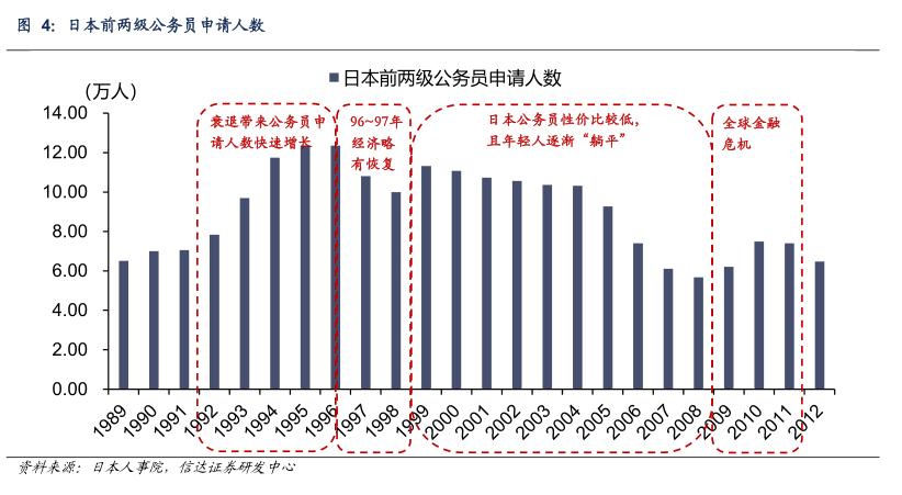 公务员申请人数在「失落的二十年」第一和第四阶段快速增长。为了保持与我国的可比性,我们统计日本前两级公务员的报名人数(日本第三级公务员高中毕业即可申请,我国公务员大学毕业才可申请)。日本经济进入衰退后,公务员申请人数快速增长,从 91 年的 7.05 万人增至 95 年的 12.4 万人,96~97 年经济略有向好带来 97~98年申请人数略有下滑,随后在 99~04 年每年的申请人数依旧保持在较高水平(超过 10 万人),05~08 年日本经济呈恢复态势,申请人数显著下滑,08 年金融危机后申请人数再次回升。我们认为,日本公务员申请人数与宏观经济存在负相关关系,即具有「逆周期」属性。