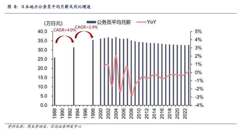 公务员平均薪酬与公司职员差异不大,且呈下降趋势。98 年之前,地方公务员平均薪酬稳定增长,98 年之后滞涨,并从 08 年开始呈下滑趋势,98~23 年平均薪酬 CAGR 为-0.3%。另外,公务员与民营企业的薪酬差距逐渐收窄,00 年,地方公务员月薪约为公司职员的 1.2 倍,22 年已基本持平。因此,日本公务员的薪酬水平愈发丧失吸引力,特别是当宏观经济向好后,更愿意到民营企业工作。
