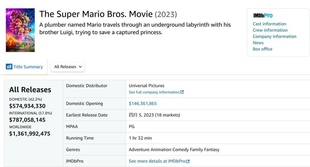 《超级马力欧兄弟大电影》得益于著名游戏厂商任天堂开发的游戏《超级马里奥兄弟》的超高知名度,在2023年上映时一举打破动画电影全球开画票房纪录,超越《冰雪奇缘2》的3.58亿美元,达到了3.77亿美元,最终以约13.5亿美元的成绩成为动画电影全球票房亚军。