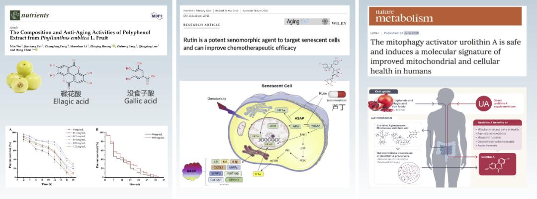 2022年:余甘子的多酚如鞣花酸、没食子酸有抗衰效果(左) 2023年:37种植物分子中,发现芦丁最能清除衰老细胞表型(中) 2019年:石榴代谢产物尿石素可提升细胞与线粒体功能从而抗衰(右)