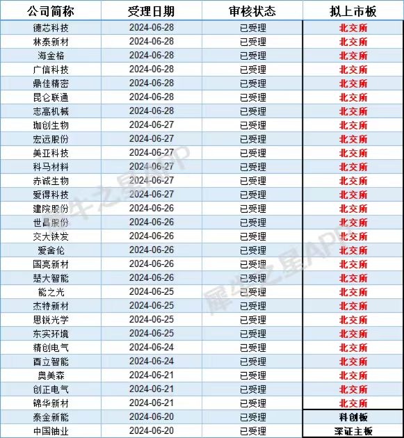 按过去的经验来看,“6·30”节点通常是企业申报IPO的高峰期,原因是在“6·30”后申报的企业都需要补充新的财报,因此有申报意愿的企业一般都会赶在“6·30”之前申报。