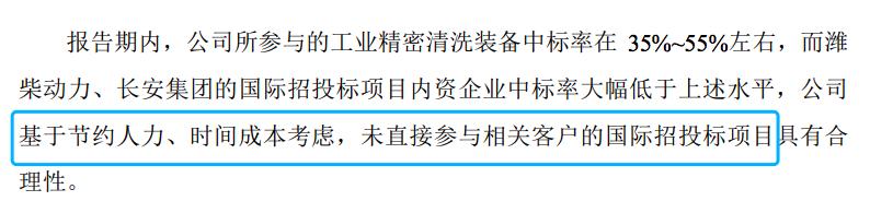 二轮回复中,大鹏工业披露称,报告期内,公司所参与的工业精密清洗装备中标率在35%-55%左右,而潍柴动力、长安集团的国际招投标项目内资企业中标率大幅低于上述水平。公司表示,基于节约人力、时间成本考虑,未直接参与相关客户的国际招投标项目具有合理性。