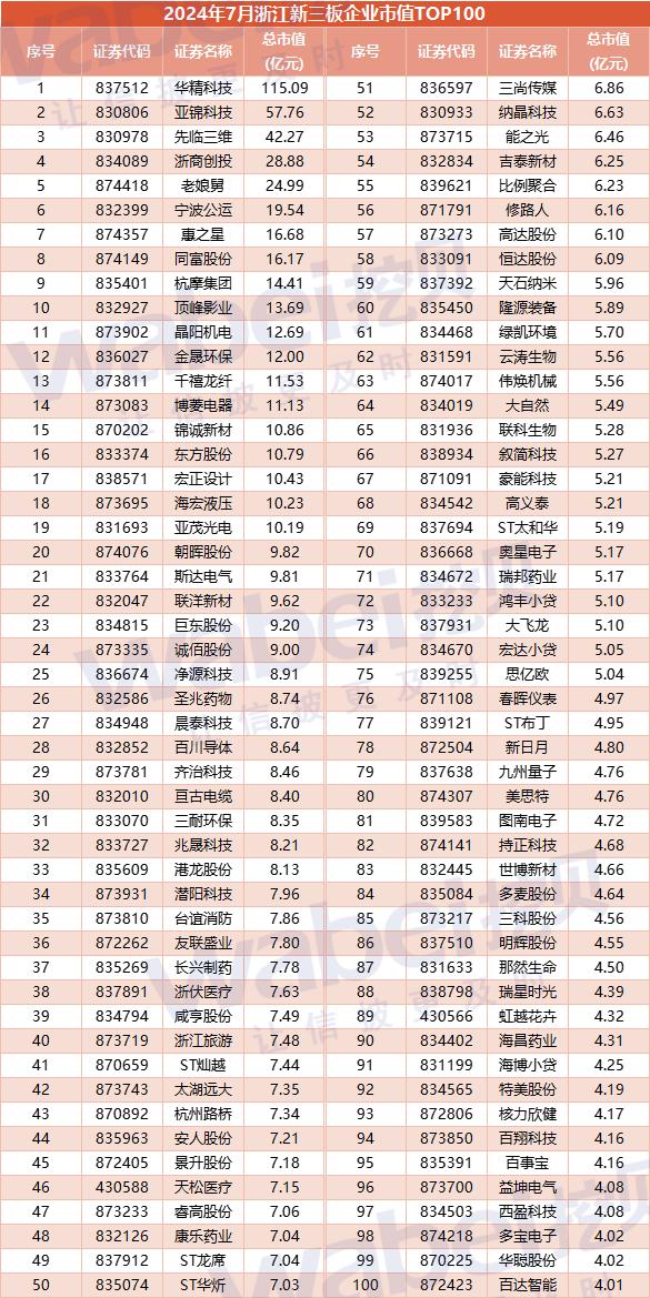 附-2024年7月浙江新三板企业市值TOP100(数据截至7月11日收盘)