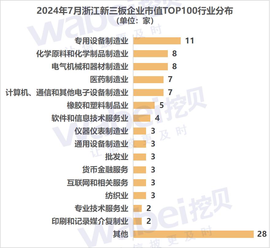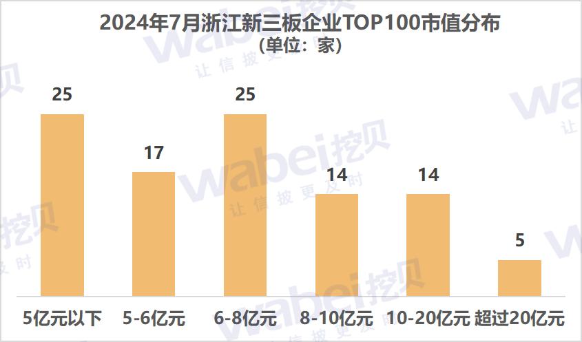 挖贝研究院梳理出2024年7月浙江新三板企业市值TOP100(以下简称:“榜单”或“TOP100”),5家企业市值超过20亿元,23家企业冲击北交所。