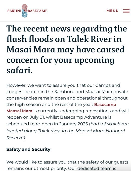 该酒店所在地区在2019年和2020年都经历了洪水。5月初的洪水,不仅冲毁了刘珈图入住的帐篷,还淹没了上游的肯尼亚马赛马拉JW万豪酒店。该酒店开业仅一年,旺季房间起价为每晚2200美元,被称为“世界最贵的万豪酒店”。然而,当天蹚过深水逃出房间的住客却认为该酒店是“死亡陷阱”。
