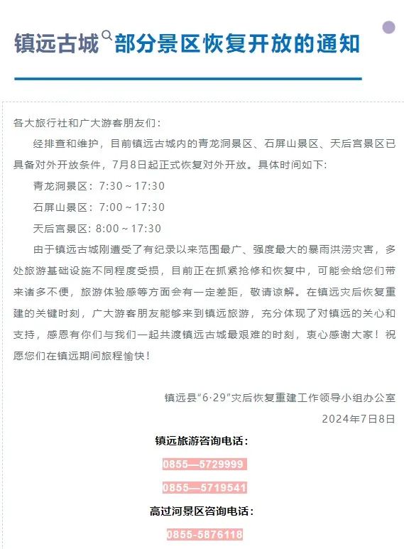 镇远古城部分景区重开通知。(图/镇远古城公众号)