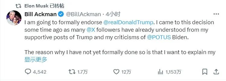 记者注意到,马斯克针对此次枪击事件在社交媒体上一连发表了多篇推文,全力为特朗普站台。此外,潘兴广场CEO比尔·阿克曼也在特朗普遇袭后宣布了对特朗普的全力支持。