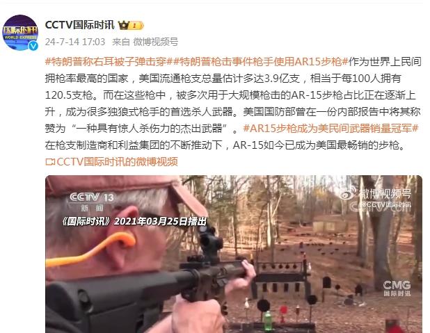 据《纽约时报》报道,执法人员从该名身亡的白人男子身上搜出了一支AR-15型半自动步枪。消息人士向ABC透露,枪手站在会场旁边的屋顶上,用一支AR式步枪发射了多达八发子弹。枪击案发生时,枪手距离会场约200~300码(180米~270米)。
