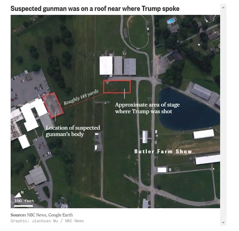 枪击嫌疑人距离特朗普舞台约150码 图片来源:NBC