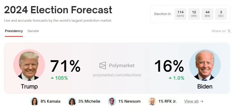预测平台Polymarket的“2024美国大选”预测显示,截至北京时间7月14日11:10,特朗普的胜率为71%,而拜登仅为16%。