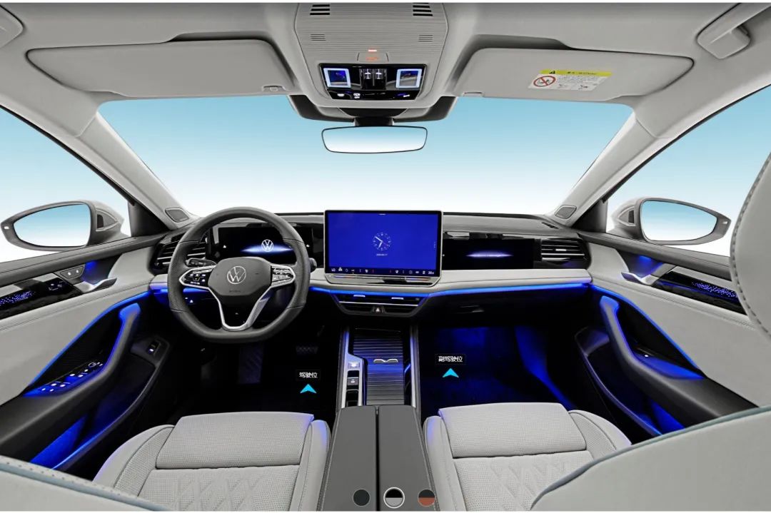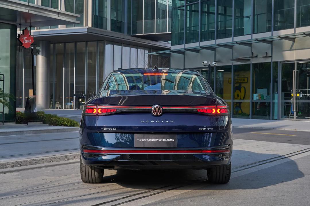 车头现在是贯穿式的日行灯,两侧是全新的矩阵式大灯,中间的大众 “W” 车标也是常亮的。