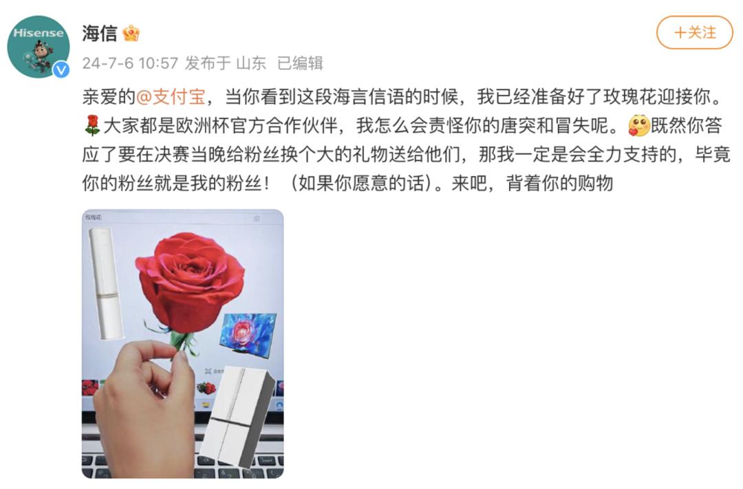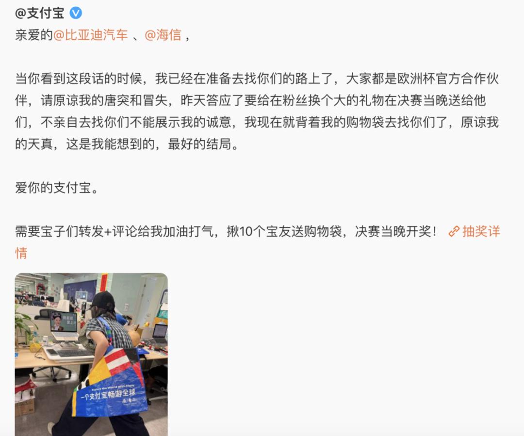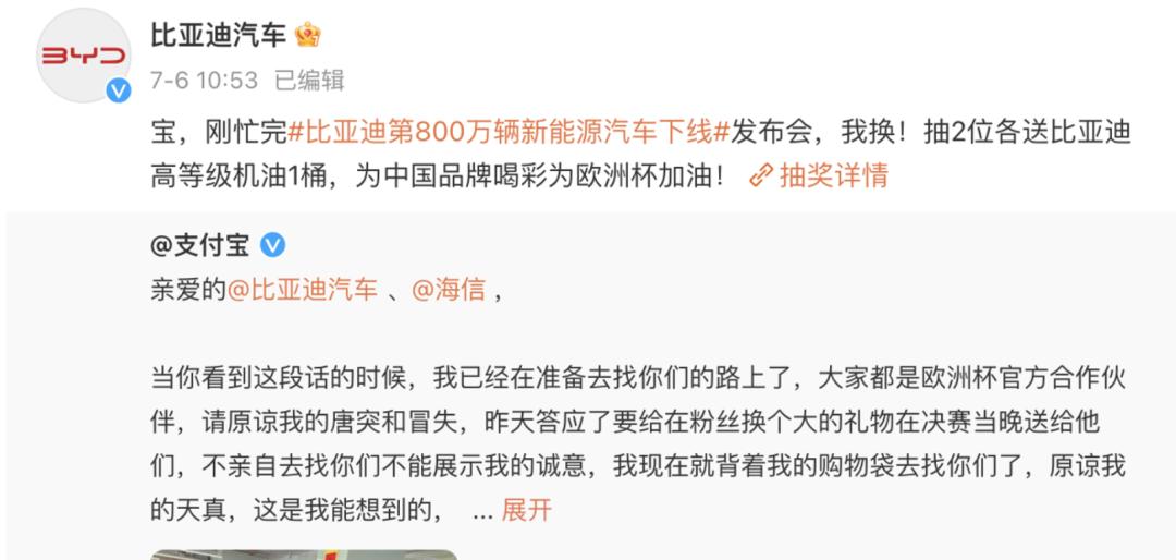 在追求短期曝光和关注度上,支付宝打法上也更为另辟蹊径。微信公众号和微博里,支付宝拉着海信和比亚迪两个赞助伙伴频繁互动,通过各种“整活”,吸引了大量用户的目光。