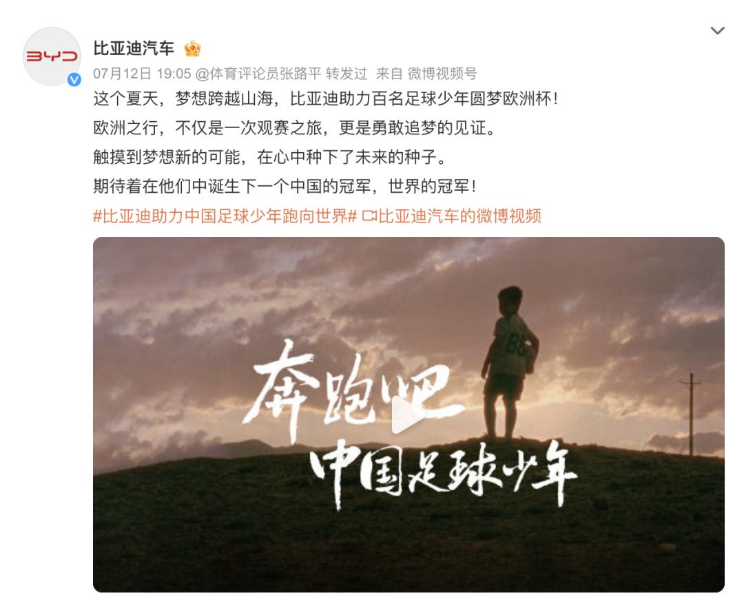 也有品牌以青少年足球公益事业为切入,通过公益活动扩大品牌影响力,比如vivo通过#贵州村超少年圆梦欧洲杯# ,以及#比亚迪助力中国足球少年跑向世界# 等话题,在社交媒体上同样抢占了不少站内声量。