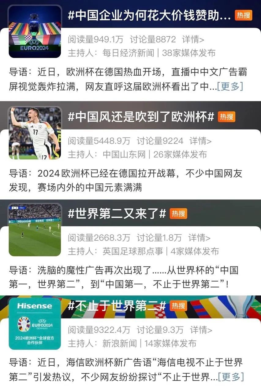 本届欧洲杯刚开赛,五家中国赞助商的广告成为了赛场上一道亮丽风景线。海信的广告语“中国第一 不止于世界第二”和“Hisense 不止于世界第二”再次引发广泛讨论。尤其是在英格兰对阵塞尔维亚的比赛中,一个“穿帮”镜头引发了关于现场广告牌究竟是中文还是虚拟替换的热议,迅速登上热搜。这让比亚迪、vivo、蚂蚁金服和速卖通的广告都得到了极大关注。