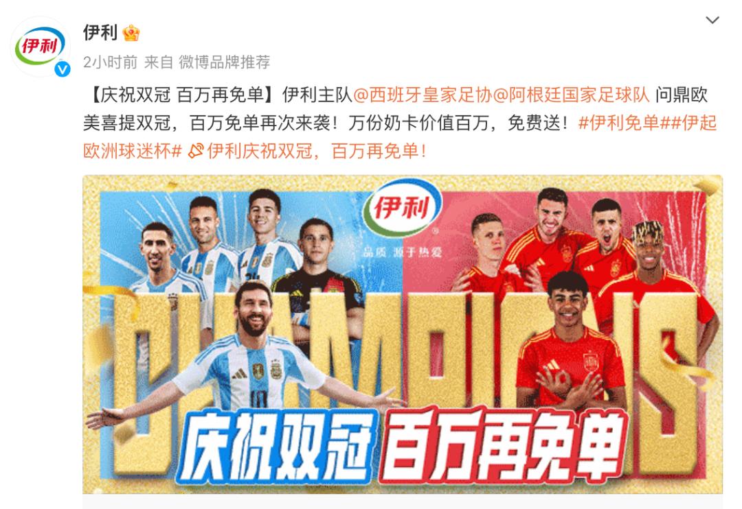 伊利则在赛前就官宣了东道主德国队、葡萄牙队和西班牙队三个夺冠热门队伍。在社交媒体,伊利发起#伊起欧洲球迷杯#、#伊利免单# 等话题,并通过引导用户参与线上互动和抽奖的方式,进行话题传播。