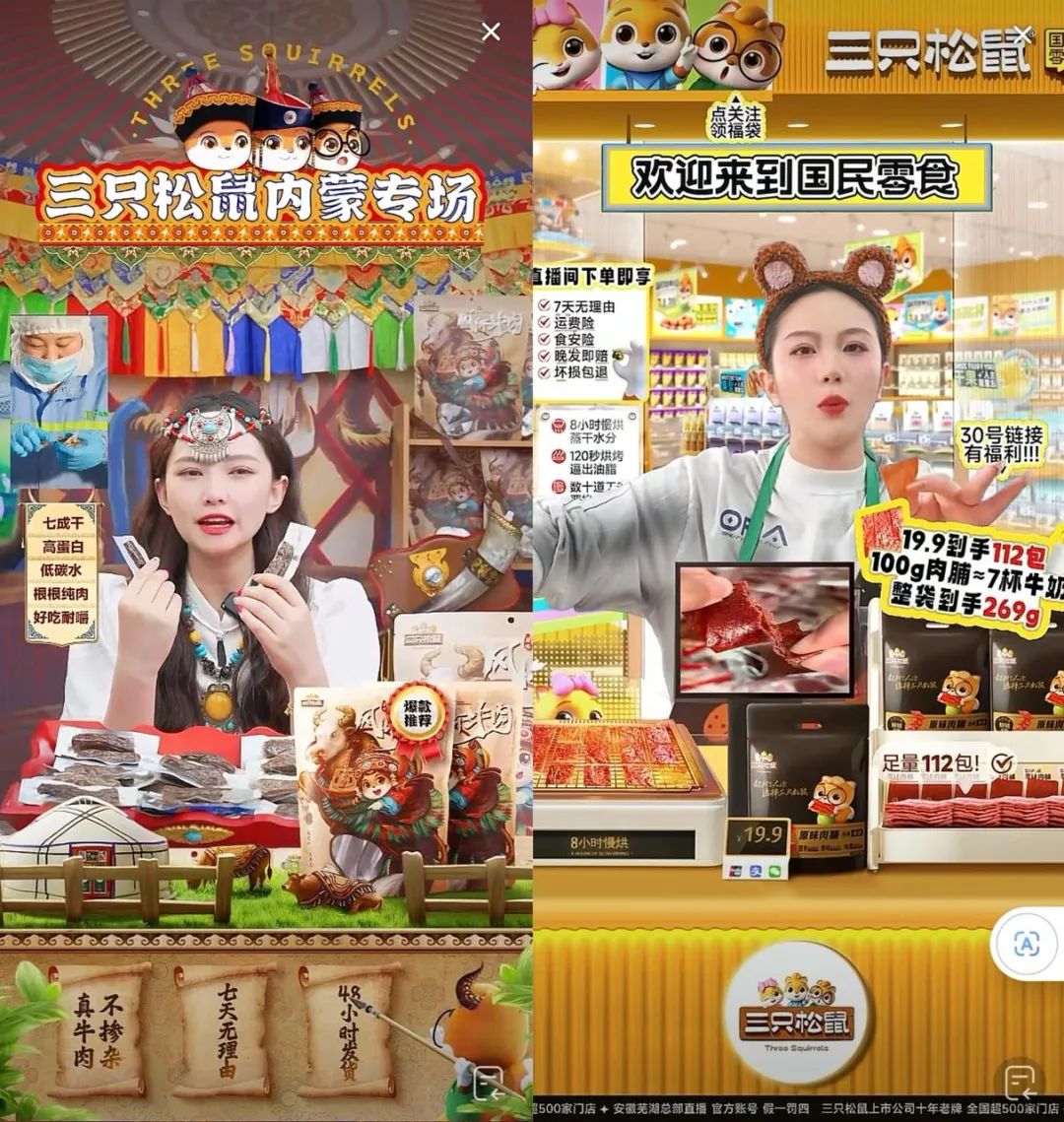同时,在三只松鼠内蒙专场直播中,主播穿着内蒙古当地服饰,直播间的布置也增加了草原、蒙古包等元素,增强场景感。三只松鼠的部分直播间还设计成了收银台场景。