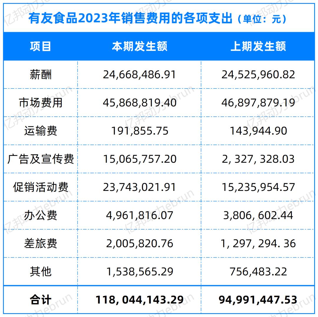 从2023年全年来看,有友食品的销售费用同比增长了24.27%。其中,由于品牌推广费用增加、开展市场促销活动增加等,其广告及宣传费、促销活动费同比增长的幅度较高,分别为547.34%、55.84%。