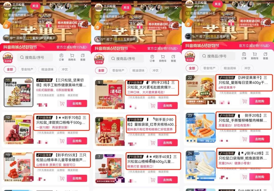 据悉,三只松鼠自去年在抖音平台发力,其采取矩阵账号的运营模式,目前该品牌在抖音中约有40个相关账号。部分账号会按品类、渠道、产品类型等进行划分,如三只松鼠坚果旗舰店、三只松鼠滋补旗舰店、三只松鼠零食礼包直播间等。