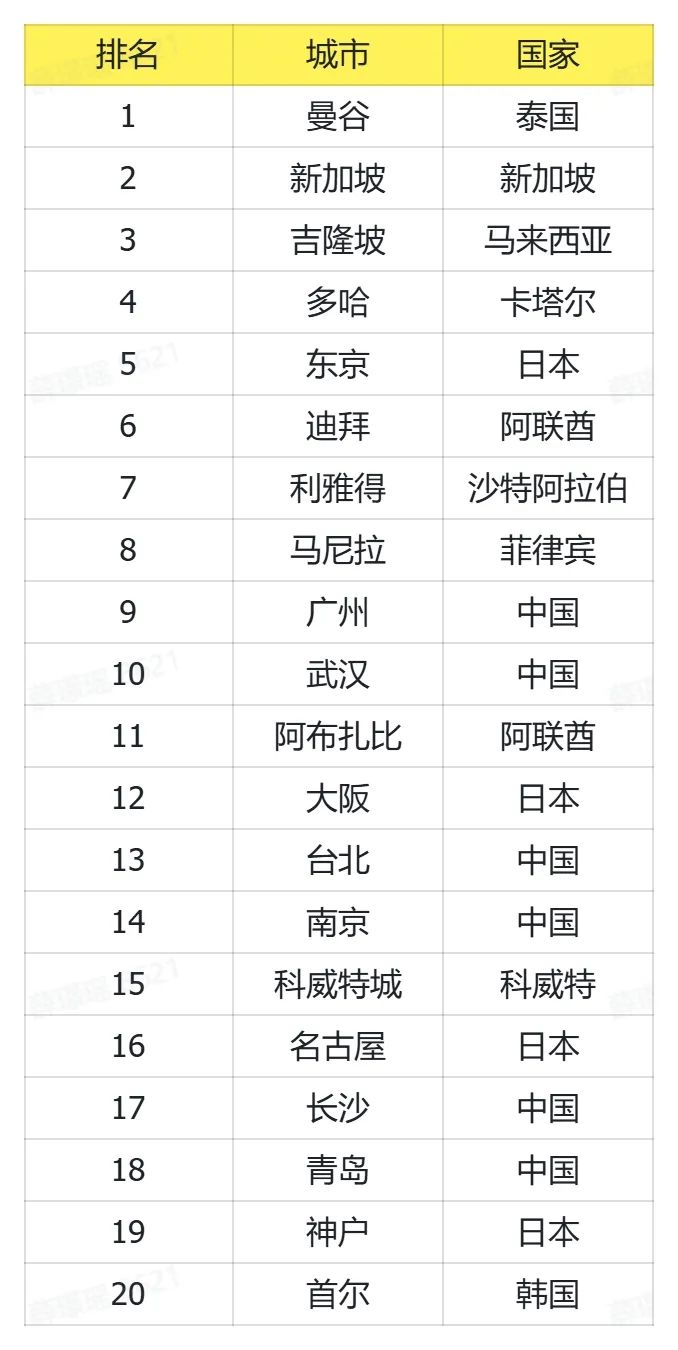 一、亚洲城市TOP 20