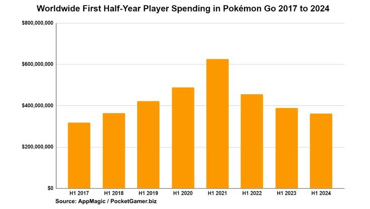 2024年上半年,《精灵宝可梦Go》在App Store和Google Play商店的全球收入达到3.614亿美元,同比下降7.1%,也创造了自2017年上半年(3.191亿美元)至今游戏半年收入的最低值。