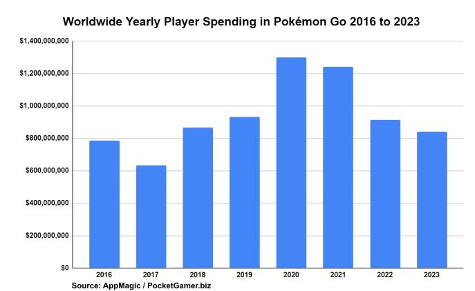 根据Appmagic的统计,2020年受疫情期间“宅经济”拉动,《精灵宝可梦Go》的营收达到顶峰,当年收入约为13亿美元。《精灵宝可梦Go》在2021年的营收小幅下降至12.4亿美元,2022年进一步缩水到了9.128亿美元,去年收入同比下降7.9%至8.411亿美元。这也是《精灵宝可梦Go》自2017年(6.345亿美元)以来年收入的最低值。