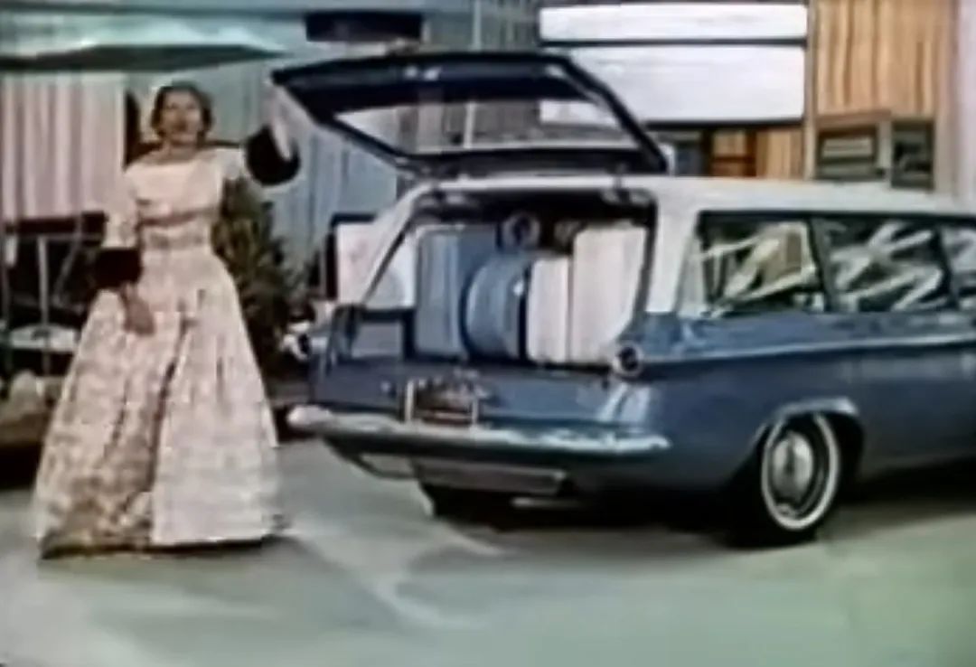 上世纪60年代初的美国雪佛兰汽车的广告里,就有穿着欧洲宫廷风大长裙的女人表演关后备箱了,不管这画面突兀不突兀,至少宣传意图表达到位——